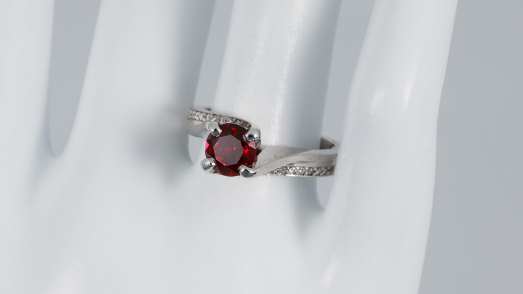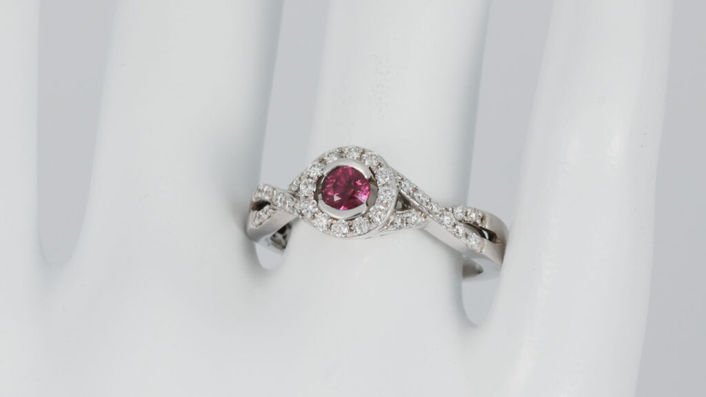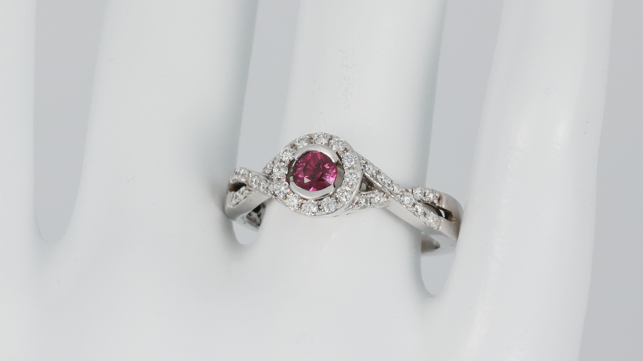 B5002 14K white gold .32ct.tw. Diamonds SI2 GH .39ct. Natural Ruby Round Sizing Additional